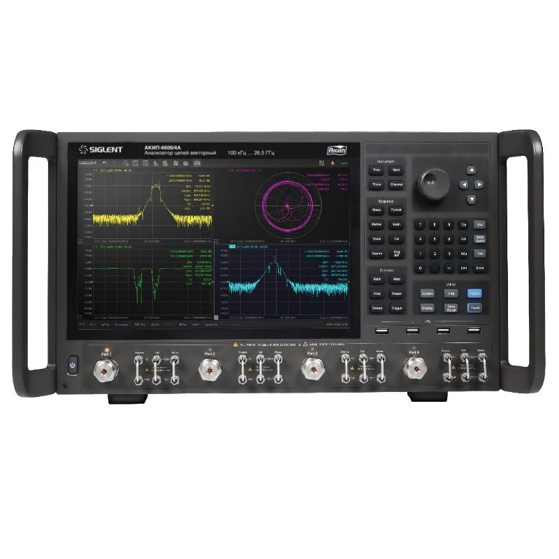 Анализатор цепей векторный АКИП-6606/4A — это современное лабораторное оборудование, предназначенное для высокоточных измерений в широком диапазоне частот от 100 кГц до 26,5 ГГц. Устройство зарегистрировано в Государственном реестре средств измерений под номером №92050-24, что подтверждает его соответствие установленным метрологическим требованиям и пригодность для использования в научных, производственных и сертификационных целях. Прибор оснащен четырьмя встроенными портами, что позволяет выполнять полный набор 4-портовых измерений S-параметров (от S11 до S44), включая дифференциальные и балансные конфигурации. Высокий динамический диапазон в 135 дБ обеспечивает точное выделение слабых сигналов на фоне шумов, что особенно важно при анализе устройств с высоким уровнем подавления или при работе в условиях сложной электромагнитной обстановки.