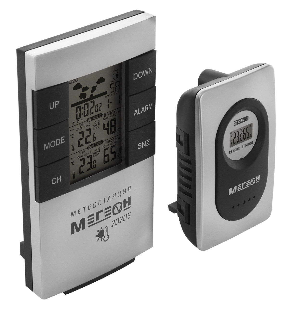МЕГЕОН 20205 — это метеостанция, которая отображает время, дату, температуру и влажность в помещении и снаружи. Метеостанция — это устройство настольного типа в стильном корпусе с большим дисплеем, которое не только показывает текущую температуру и влажность, но и делает прогноз погоды на ближайшие сутки, считывая информацию с одного или нескольких внешних блоков, дальность размещения которых от основного блока может достигать 30-ти метров. Помимо этого изделие самостоятельно определяет фазы Луны. Формирует индикатор комфорта исходя из показаний температуры и влажности в помещении, которые, в свою очередь, могут влиять на быструю утомляемость, например, детей в процессе обучения или работников в кабинете. Прибор также успешно заменит будильник и станет незаменимым помощником по созданию комфортных условий в домашних и промышленных строениях.
